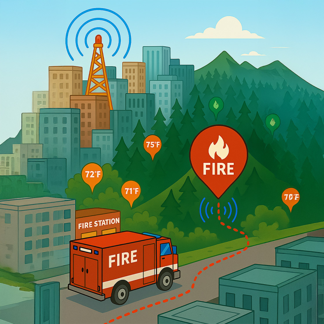 Forest Fires and Environmental SafetyMonitors temperature, humidity, and smoke data in forested and mountainous areas with low-energy sensors; detects fire risks early.